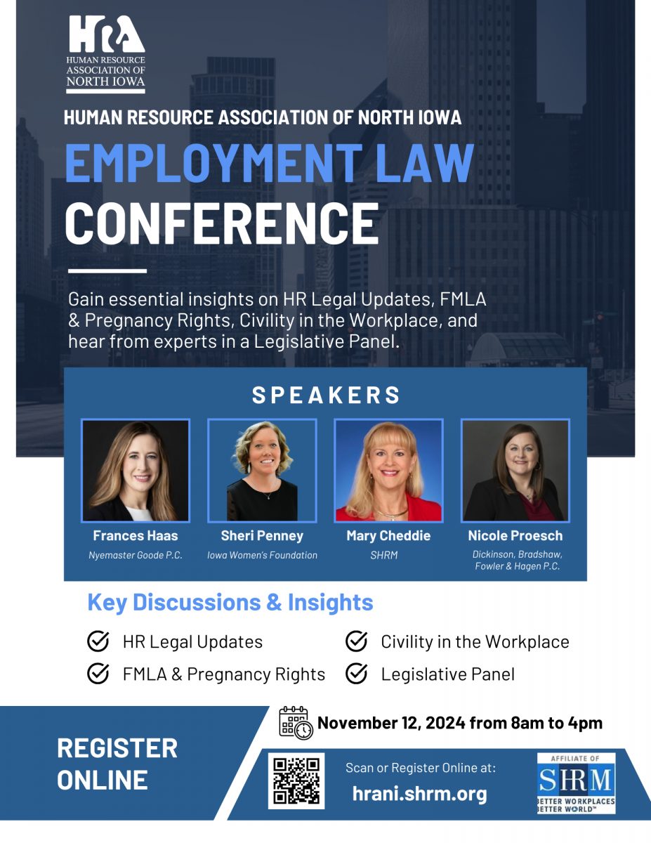Join us for the Human Resource Association Employment Law Conference on November 12th, from 8 AM to 4 PM, at the NIACC Muse Norris Conference Center. This event is a valuable opportunity to stay informed on the latest legal updates and best practices in employment law. Don't miss out on this informative and engaging conference—register now via 2024 HRANI Employment Law Conference Tickets, Tue, Nov 12, 2024 at 8:00 AM | Eventbrite.