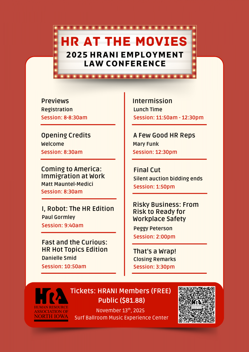 | Location: | HRANI Employment Law Conference Welcome to the HRANI Employment Law Conference! Join us for a day filled with insightful discussions, networking opportunities, and expert speakers sharing their knowledge on all things employment law. This in-person event will be held at the Surf Ballroom Music Experience Center. Topics for the day include: Ethics of AI, OSHA, Immigration, Depositions and Hot Topics of 2026. Don't miss out on this chance to stay updated on the latest legal trends and connect with professionals in the field. Register now! Thursday, November 13 · 8am - 4pm CST Register NOW: https://www.eventbrite.com/e/hrani-employment-law-conference-tickets-1743348465189?utm-campaign=social&utm-content=attendeeshare&utm-medium=discovery&utm-term=listing&utm-source=cp&aff=ebdsshcopyurl |